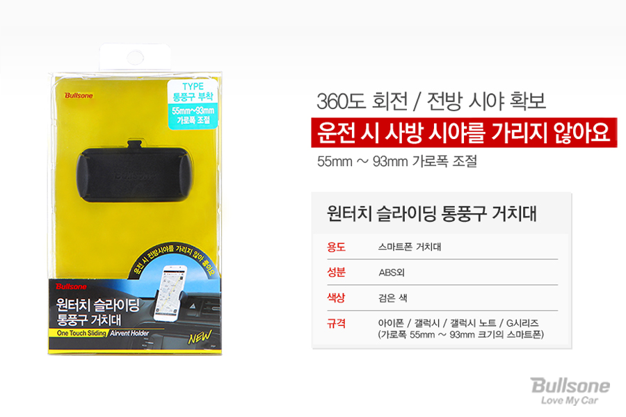 불스원 원터치 슬라이딩 통풍구 스마트폰 거치대는 굉장히 작은 크기로 통풍구에 설치할 수 있습니다. 크기가 작기 때문에 운전 시야에 가려지지 않을뿐더러, 통풍구 타입으로 차량 에어컨 쪽에 스마트폰을 설치할 수 있어, 전방 시야 확보와 안전운전에 좋습니다.