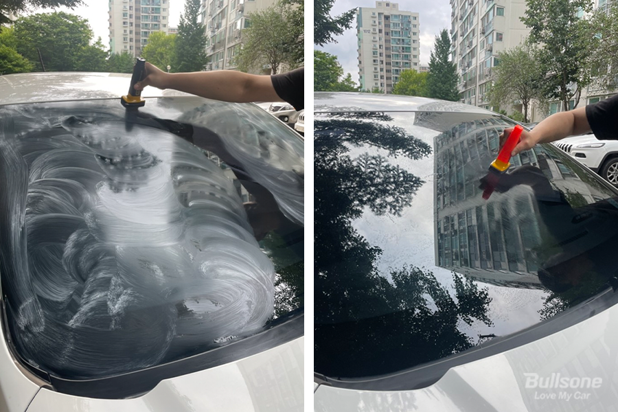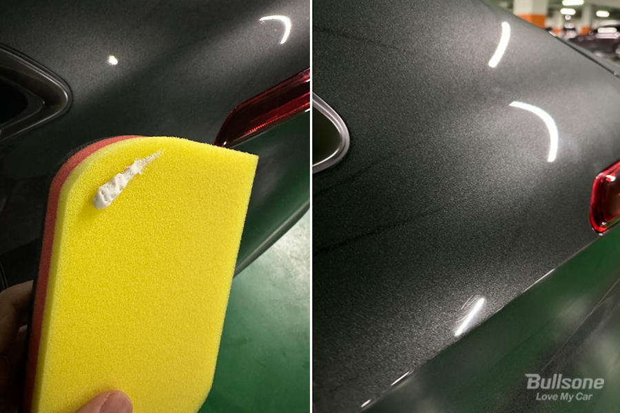 순서대로 불스원 3 스텝 컴파운드를 사용하여 작업을 해주었더니 금방 지워져서 깜짝 놀랐다고 합니다. 위에 흠집이 난 사진과, 아래 흠집이 지워진 사진을 비교해 보면 전과 후과 확실하게 차이나는 모습을 볼 수 있습니다. 앞으로 새똥은 물티슈로 절대 박박 문질러 닦지 않겠다는 두근업님.
