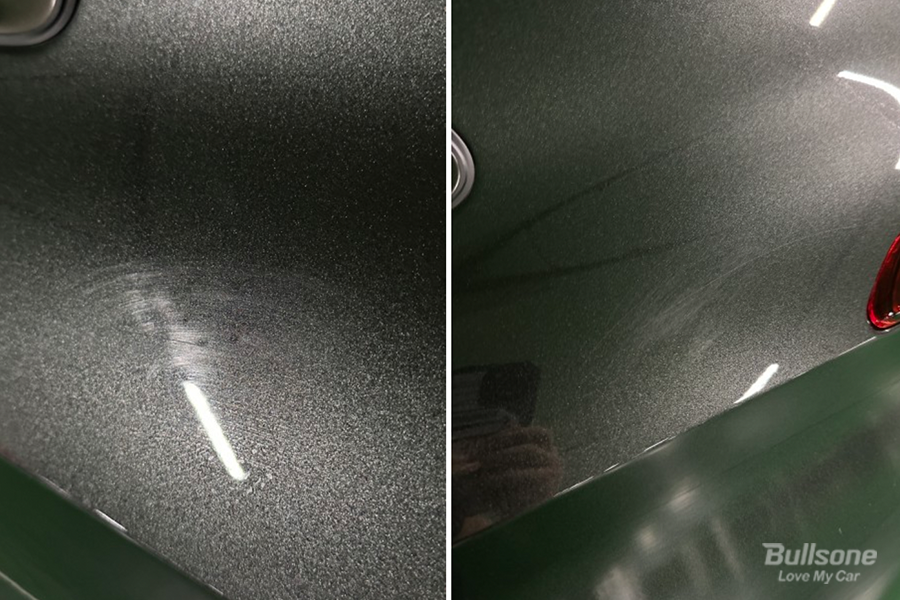 순서대로 불스원 3 스텝 컴파운드를 사용하여 작업을 해주었더니 금방 지워져서 깜짝 놀랐다고 합니다. 위에 흠집이 난 사진과, 아래 흠집이 지워진 사진을 비교해 보면 전과 후과 확실하게 차이나는 모습을 볼 수 있습니다. 앞으로 새똥은 물티슈로 절대 박박 문질러 닦지 않겠다는 두근업님.