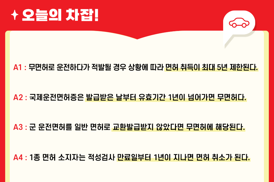 오늘은 면허증에 대한 안전운전 내용들에 대해 차문차답을 해보았는데요. 모든 질문 속에는 안전에 관한 이야기가 있으므로, 안전운전을 위해 필요한 내용입니다. 다음 주 역시 많은 분의 궁금증이 사라질 수 있도록 좋은 정보로 찾아뵙겠습니다!