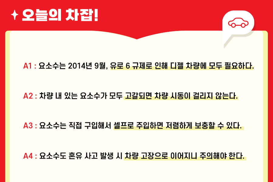 오늘은 요소수에 대한 내용들에 대해 차문차답을 해보았는데요. 모든 질문 속에는 안전에 관한 이야기가 있으므로, 안전운전을 위해 필요한 내용입니다. 다음 주 역시 많은 분의 궁금증이 사라질 수 있도록 좋은 정보로 찾아뵙겠습니다!