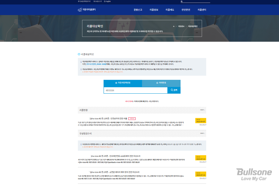 자동차리콜센터(https://www.car.go.kr/ri/recall/list.do)에 들어가면 리콜에 관한 모든 정보를 확인할 수 있습니다. 리콜대상확인에 내가 타고 있는 차량번호만 입력해도 어떤 리콜이 발생하였는지를 직접 확인할 수 있습니다.