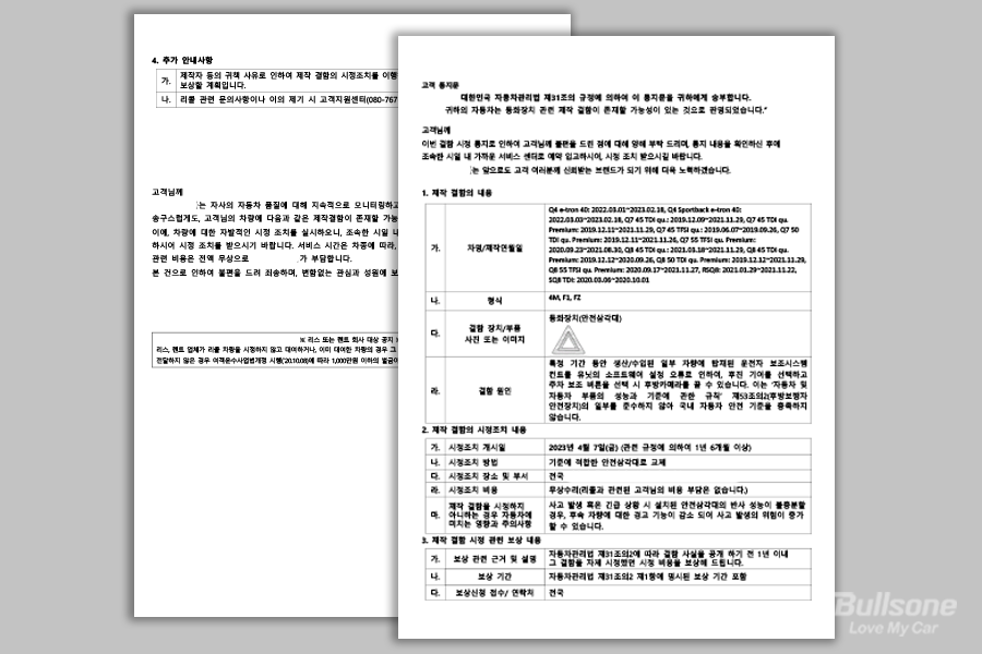 차량 부품의 결함으로 운전자가 불편함을 겪을 수는 있으나 안전성에는 문제가 없어, 운전자가 다칠 위험이 없는 부품들에 하자가 있을 때 시행하는 조치이기도 합니다. 다만 제조사에서 공지한 기간 내 수리가 가능한 경우가 많아서, 잘 체크하지 않으면 모르고 지나가는 경우도 많습니다.