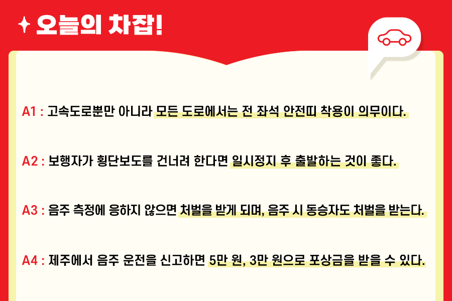 오늘은 추석 연휴 안전운전에 대한 내용들에 대해 차문차답을 해보았는데요. 모든 질문 속에는 안전에 관한 이야기가 있으므로, 안전운전을 위해 필요한 내용입니다. 다음 주 역시 많은 분의 궁금증이 사라질 수 있도록 좋은 정보로 찾아뵙겠습니다!