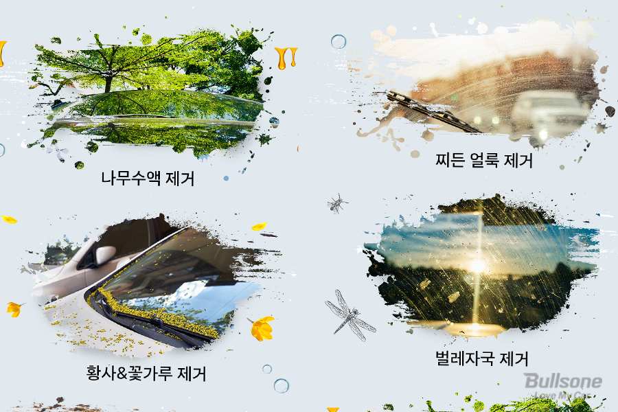 불스원 3배 빠른 발수코팅워셔는 가장 기본적인 성능이 좋기 때문에, 곡물발효 에탄올을 통해 찌든 얼룩 제거, 벌레자국 제거, 나무수액 제거, 흙탕물 제거, 황사 꽃가루 제거에 탁월합니다.