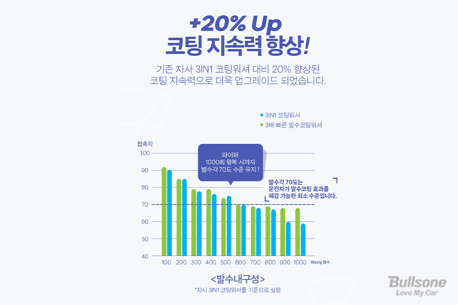 발수각 70도는 운전자가 발수코팅 효과를 체감하는 최소 수치인데, 1,000회 와이퍼 작동 시에도 70도가 유지될 수 있도록 성능을 구현해 워셔액 중에서도 최고의 발수 성능을 자랑합니다.