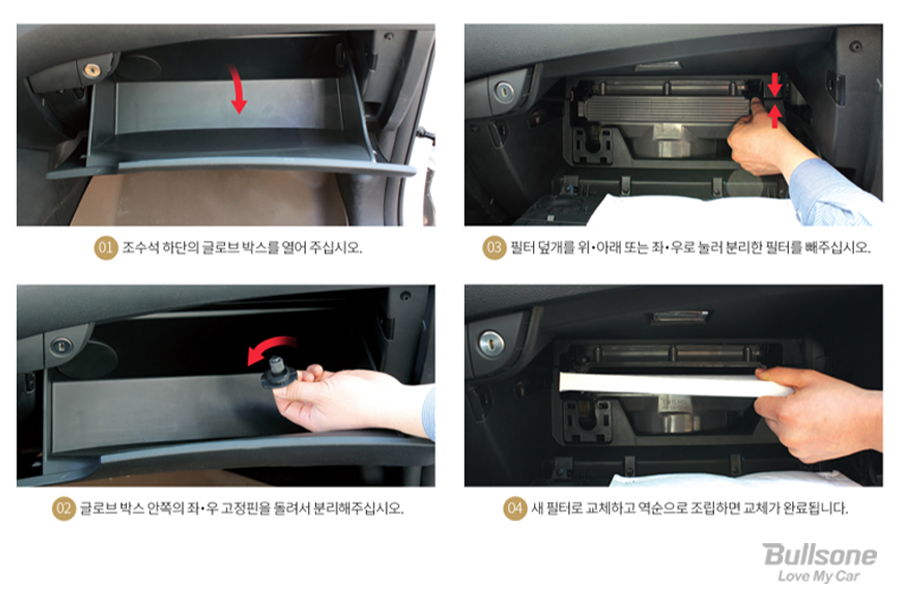 올바른 교체주기는 10,000km 주행을 하거나 6개월마다 교체해 주는 것이고 필터 교체는 셀프로도 너무 쉽게 할 수 있습니다. 조수석 글로브 박스를 열어 준 후 안쪽의 좌 우 고정핀을 돌려 분리해 줍니다. 이후 기존의 필터를 빼고 나서, 새 필터를 교체한 다음 역순으로 조립하면 끝! 누구나 쉽게 교체할 수 있답니다. 셀프 교체를 통해 내 차의 퀴퀴한 냄새를 깨끗하게 잡아보세요!