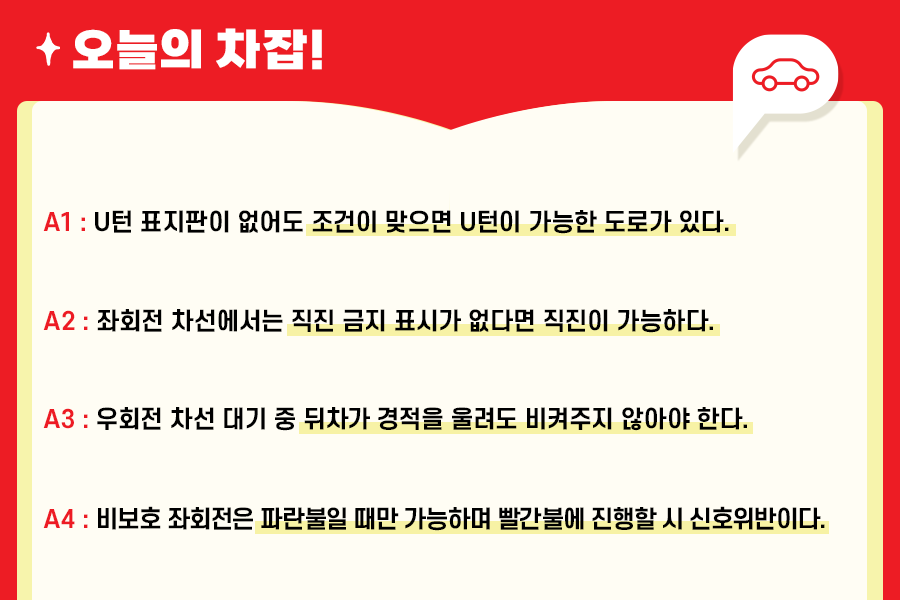 오늘은 신호에 대한 내용들에 대해 차문차답을 해보았는데요. 모든 질문 속에는 안전에 관한 이야기가 있으므로, 안전운전을 위해 필요한 내용입니다. 다음 주 역시 많은 분의 궁금증이 사라질 수 있도록 좋은 정보로 찾아뵙겠습니다!