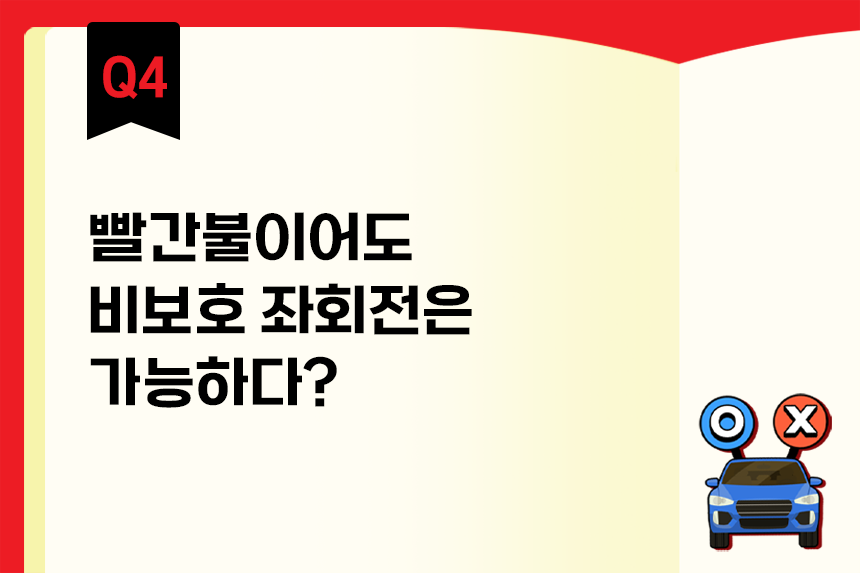 비보호 좌회전은 말 그대로 보호가 되지 않는 좌회전 구간입니다. 통행권을 보호받지 못하는 조건부로 허가되는 좌회전 표시입니다. 때문에 비보호 좌회전은 파란불에서만 가능합니다. 적색 신호에서는 절대적으로 비보호 좌회전을 행해선 안됩니다. 빨간불에서 주행하는 것은 신호위반입니다.