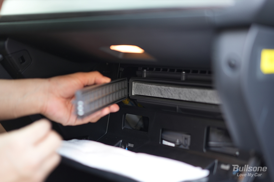 불스원 냄새제로 차량용 에어컨필터를 새롭게 꺼내고, 방향에 맞게 기존 필터 위치에 넣어줍니다.
