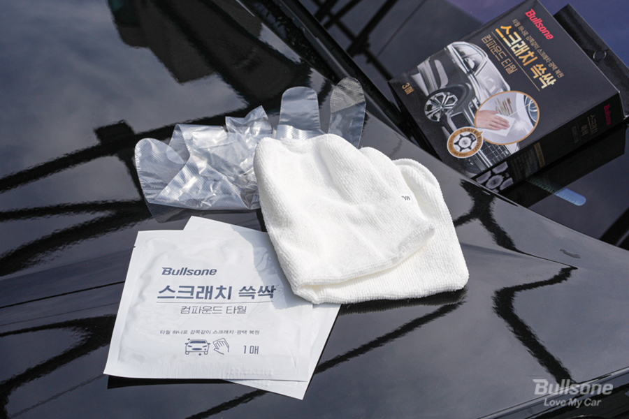 불스원 스크래치 쓱싹 컴파운드는 타월로 구성되어 있어 휴대하기가 굉장히 편해서, 트렁크 같은 수납공간에 보관하고 다니시면 비상 순간에 사용할 수 있습니다. 여러 번 작업을 해야 하는 일반적인 컴파운드와 달리, 타월로 문지르기만 해 주면 흠집 복원은 물론 광택에 발수코팅까지 해주기 때문에 굉장히 편하게 사용할 수 있고 순식간에 차량을 깨끗하게 복원시킬 수 있습니다.
