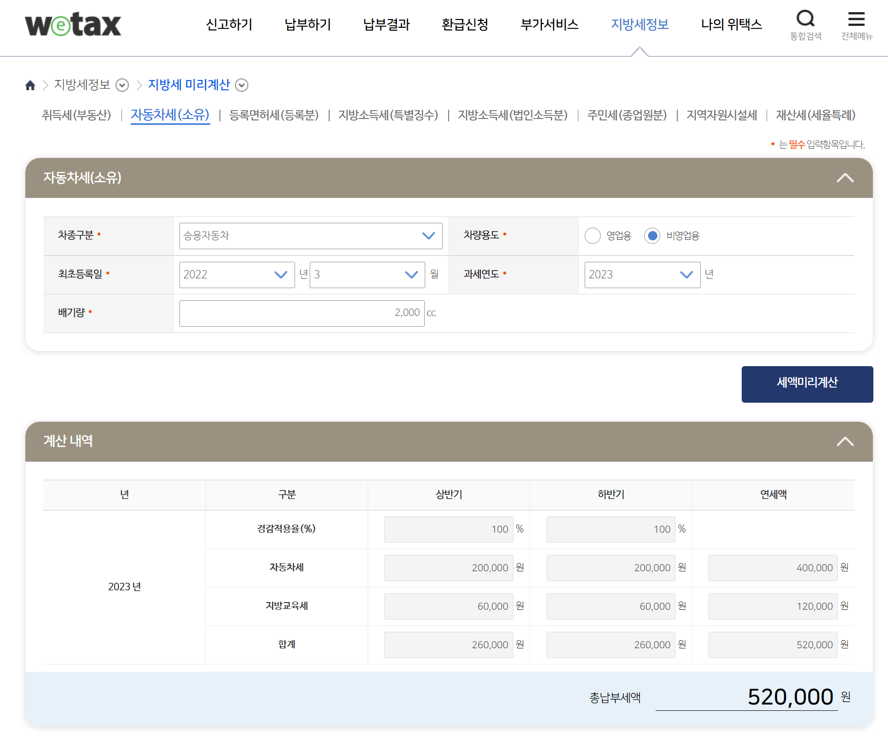 2,000cc 차량은 520,000원 (교육세 30% 포함)