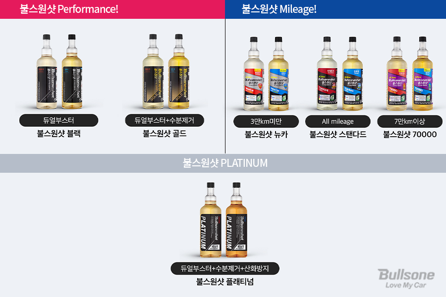 연료첨가제인 불스원샷은 크게 마일리지, 퍼포먼스, 플레티넘, 시그니처로 나누어져 있습니다.