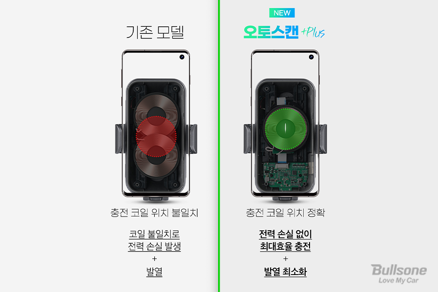 반면 오토스캔 플러스는 충전 코일 위치를 정확하게 맞추고, 전력 손실 없이 최대 효율로 충전이 가능합니다. 거기에 발열까지 최소화를 시켜 무선충전거치대의 제 성능을 발휘할 수 있습니다. 때문에 거치대를 고민하신다면 현재 모든 기능을 다 갖추고, 개선까지 완료된 2세대 오토스캔 플러스를 사용하시는 것을 적극 추천드립니다.
