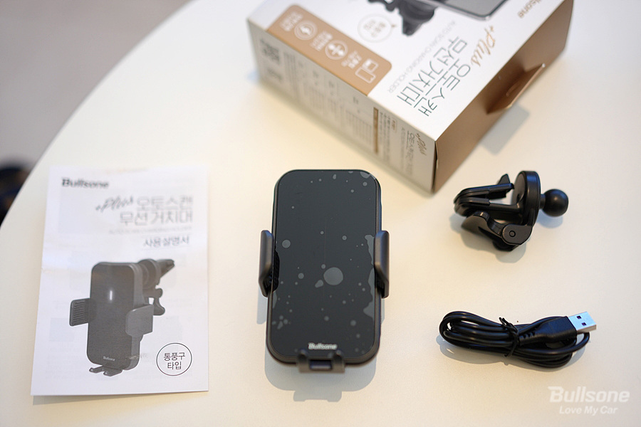 구성품은 본체와, 통풍구형 고정 클립, 고속 무선충전이 가능한 USB 이렇게 세 가지로 구성이 되어 있습니다.