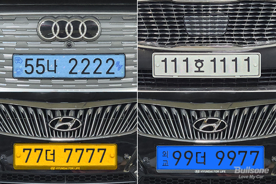 ① 하늘색 번호판은 친환경차를 뜻합니다. 전기차나 수소차가 해당됩니다. ② 하얀색은 일반 승용차를 뜻하고, 기존까지는 법인차량도 포함이었습니다만, 내년 1월 1일부터는 법인차는 연두색 번호판으로 바뀝니다. ③ 노란색은 영업용 차량을 뜻합니다. 택시나 버스, 택배차량 같은 영업용 차량이 해당됩니다. ④ 남색은 외교용 차량입니다. 외교관이 탑승한 차량이며 앞에 한글로 외교라고 표기가 되어 있습니다.