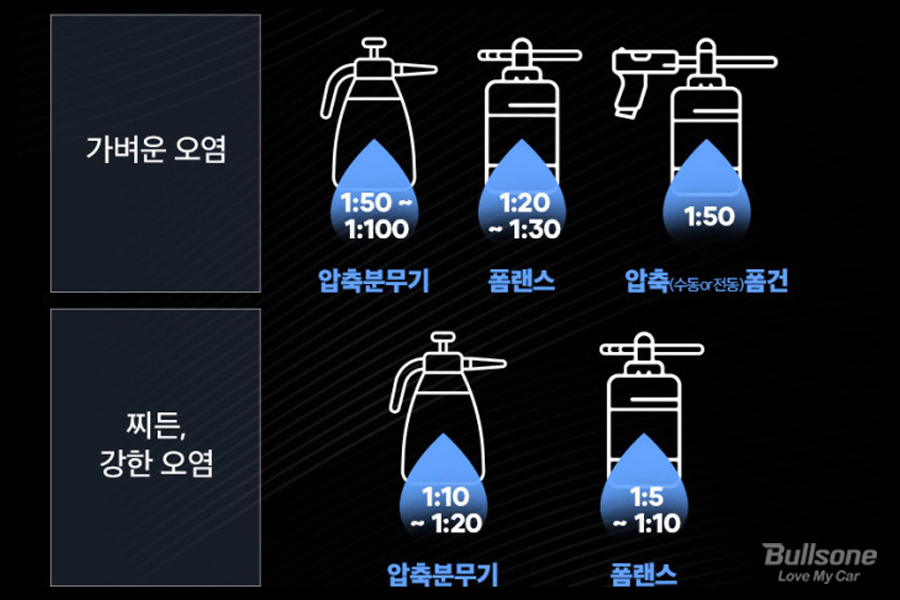 비율은 내가 사용하는 세차용품에 따라 조금씩 다른데요, 찌든, 강한 오염 기준으로 1:10 정도의 비율을 사용하면 풍성하고 깨끗하게 사용할 수 있습니다.