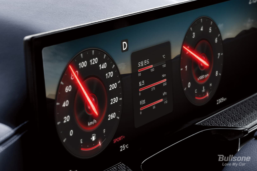 실내는 수평형 레이아웃을 기준으로 잡고 클러스터와 센터 디스플레이가 하나로 연결된 디자인을 선보이고 있습니다. 심리스 한 디자인을 적용해 감성을 더했고, 터치 타입의 공조 장치는 편의성을 높여 더욱 고급스러움을 나타냅니다.
