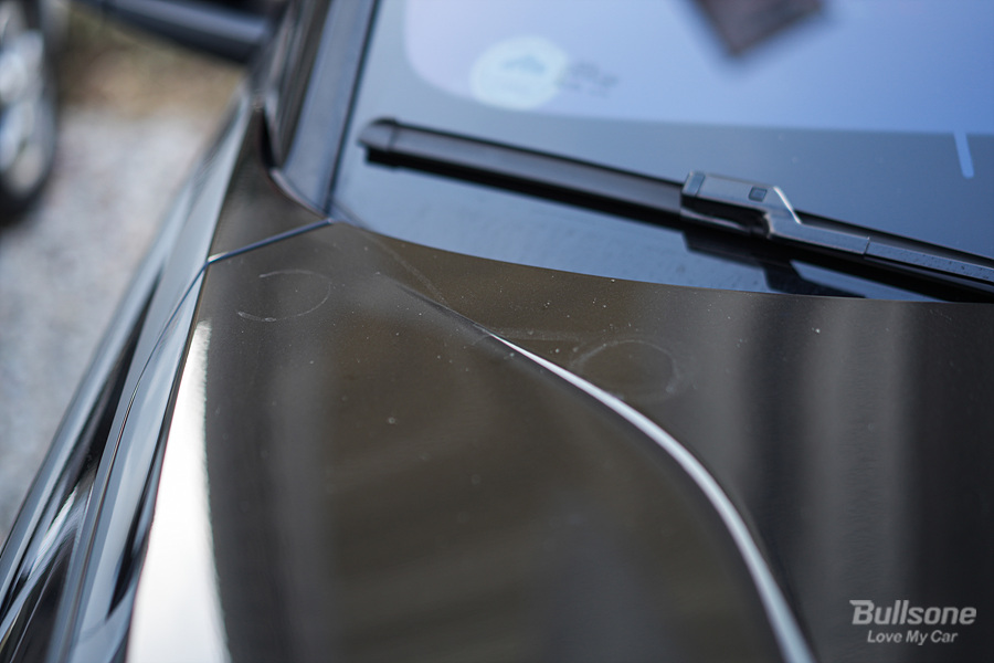 앞 차량에서 뭐가 튀었는지 보닛에 뭐가 많이 묻어있더라고요. 왼쪽에는 누군가가 무언가 올려놓은 자국까지 그대로 남아있었습니다.