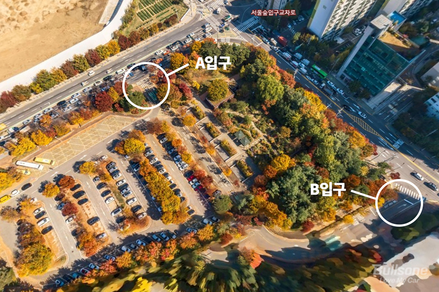 서울숲 주차장도 비교적 서울 도심치고 굉장히 저렴하면서 많은 차량이 주차할 수 있는 큰 공간인데요. 그럼에도 불구하고 주말은 차량이 줄지어서 들어갈 정도로 굉장히 많은 사람들이 방문하고 있습니다. 여기서 한 가지 꿀팁을 드리자면 주차장에 들어갈 수 있는 입구가 두 곳입니다. A입구, B입구인데요.