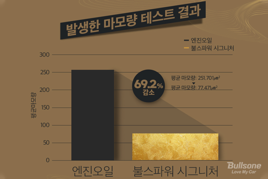 자체 테스트 결과 기존 엔진오일에서 불스파워 시그니처를 사용하면 마모량의 69%가 감소되며, 마찰계수는 43% 감소해 윤활력이 좋아집니다. 엔진코팅제인 불스파워를 사용하면 이렇게 큰 차이가 나는 것을 확인할 수 있으며, 실제 주행감각에서도 체감이 되기 때문에 엔진 관리를 위해 꼭 사용해야 하는 필수 차량관리 용품입니다.