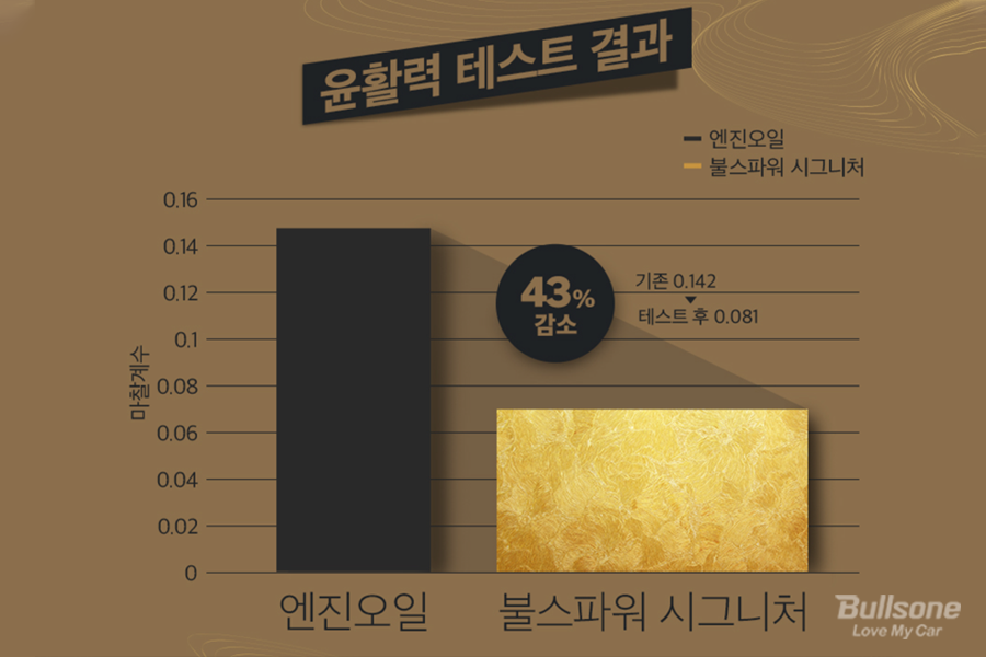 자체 테스트 결과 기존 엔진오일에서 불스파워 시그니처를 사용하면 마모량의 69%가 감소되며, 마찰계수는 43% 감소해 윤활력이 좋아집니다. 엔진코팅제인 불스파워를 사용하면 이렇게 큰 차이가 나는 것을 확인할 수 있으며, 실제 주행감각에서도 체감이 되기 때문에 엔진 관리를 위해 꼭 사용해야 하는 필수 차량관리 용품입니다.