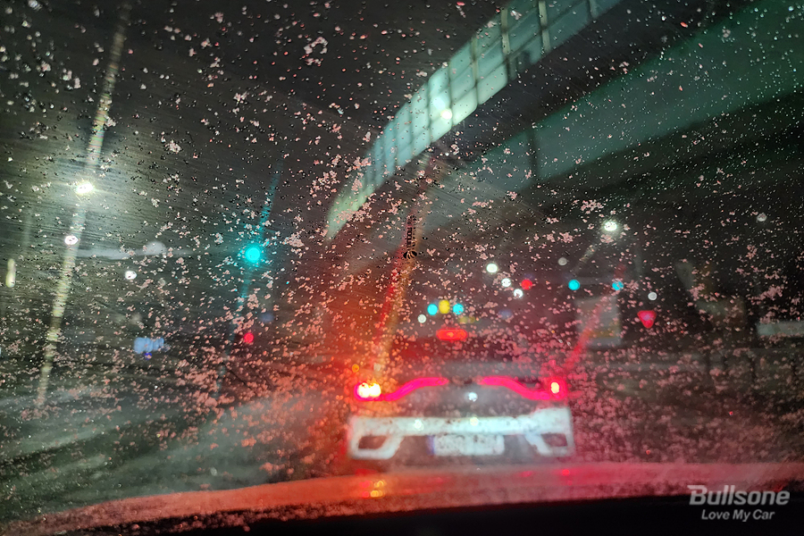 특히 이렇게 눈이 쌓이거나, 비가 오는 날에는 유리 관리를 잘해주지 않는다면 물때 자국과 먼지가 쌓여있는 모습을 쉽게 볼 수 있습니다. 이런 상황에는 차에서 내리기 전에 와이퍼를 사용해서 앞유리를 닦아주고 내리는 것이 좋고요.