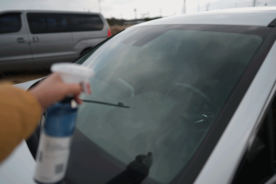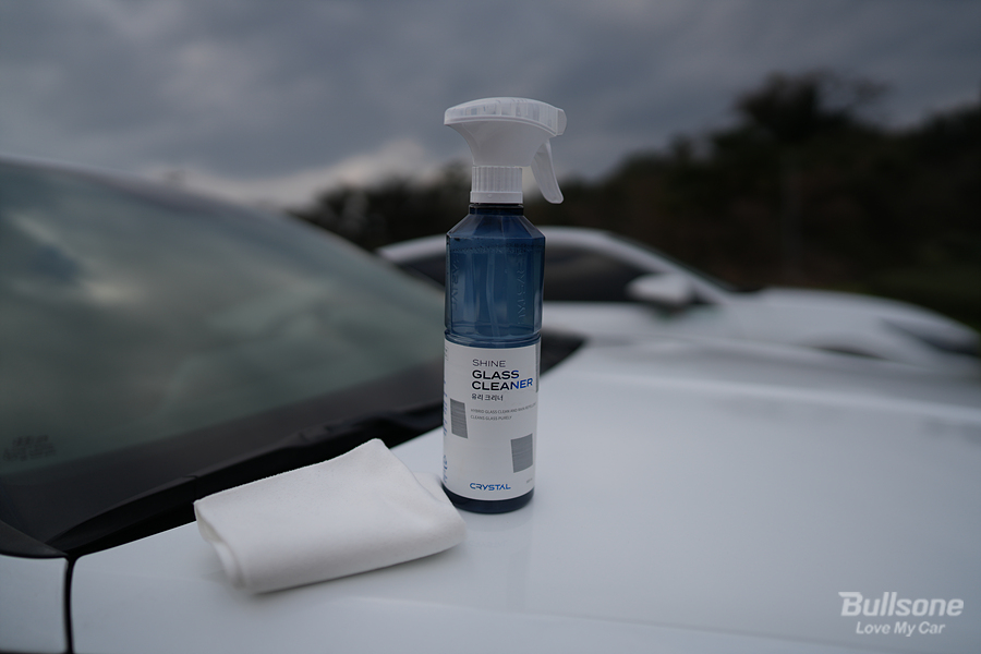 뿌리고 닦는 것만으로도 유리가 깨끗해지기 때문에, 꼭 세차장이 아니더라도 어디에서든 시공이 가능합니다. 운전 중 휴게소나 졸음쉼터로 이동해서 잠깐 닦아줘도 좋고, 이렇게 주차장에서도 가볍게 사용하여 깨끗한 유리를 만들어줄 수 있습니다.