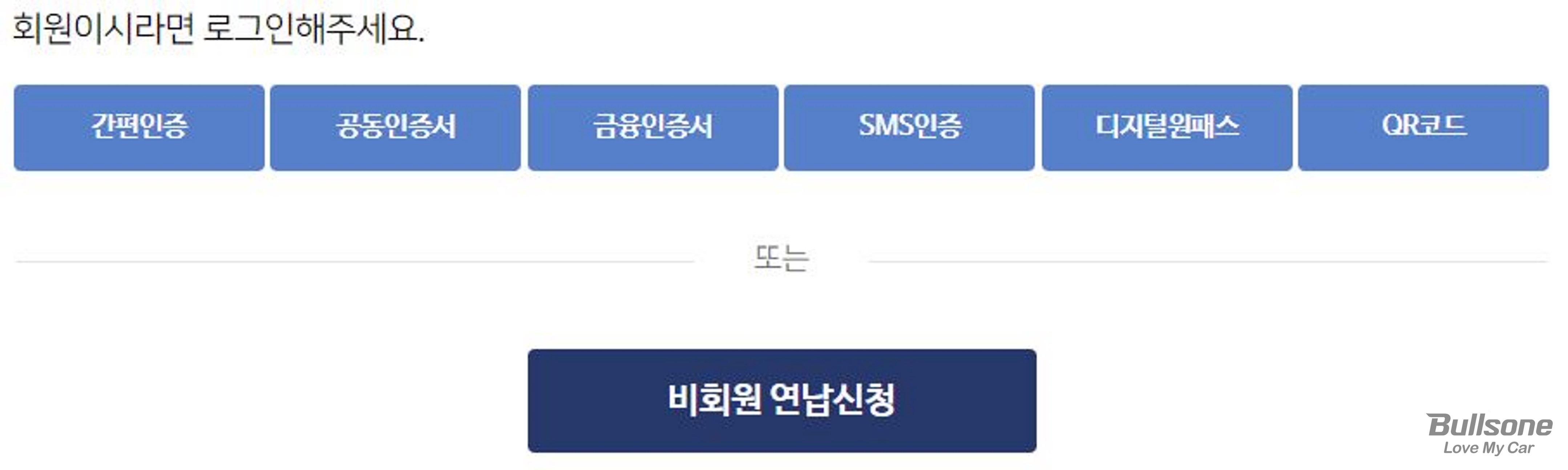 신청 버튼 클릭 이후에 간편인증, 공동인증 등 개인정보를 통해 회원 로그인을 하시거나 비회원 연납신청을 진행하면 모든 절차가 완료됩니다. 참 간단하죠?