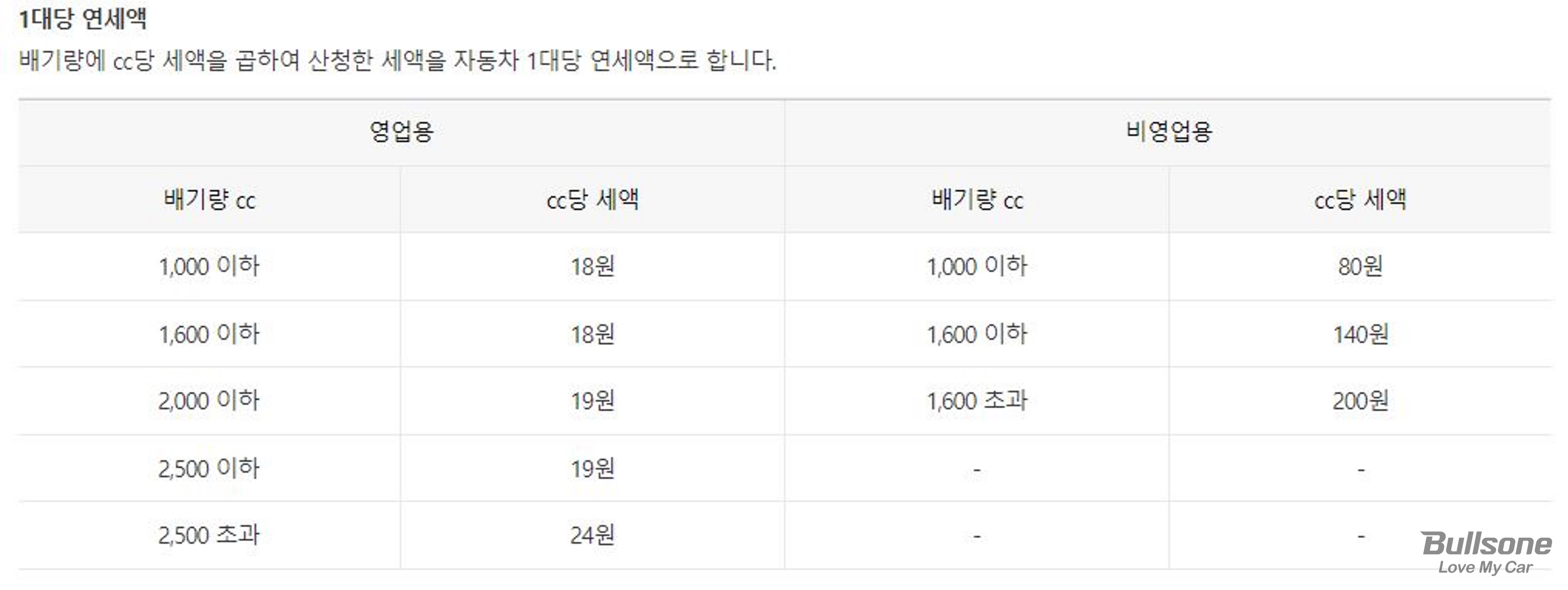 승용차 1대당 1년치 세액은 차량마다 차이가 있는데, 아래 표를 확인하시고 본인 소유 자동차 배기량에 대입해서 계산하실 수 있구요, 지방세 온라인 납부 플랫폼인 위택스 자동차세 계산기를 통해서도 언제든 편하게 확인이 가능합니다.