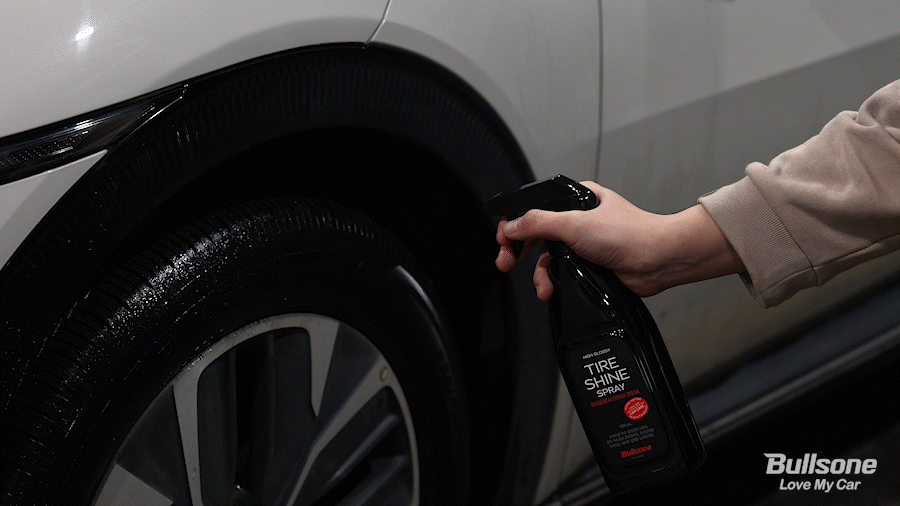 불스원의 다른 세차 용품들처럼 사용 방법도 아주 간단한데요, 세차가 끝난 타이어에 불스원의 하이글로시 타이어 코팅제를 분사해, 고르게 펴발라 시공해주세요.