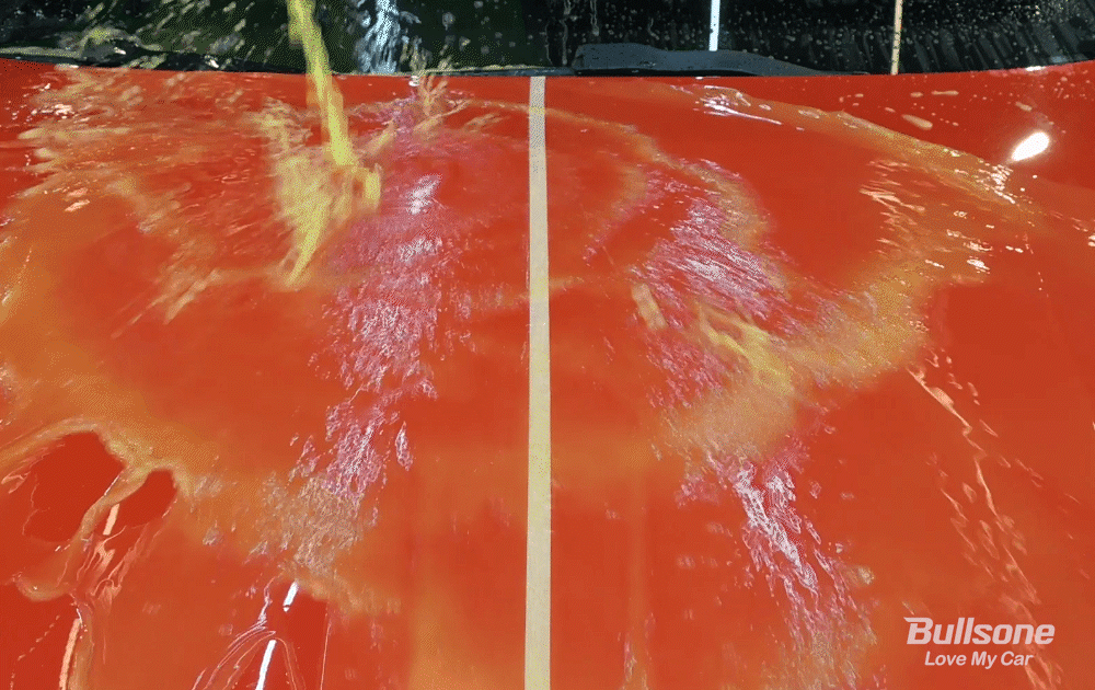 물을 충분히 뿌린 차체에 파워 폼 뿌리는 카샴푸를 골고루 분사해주세요.