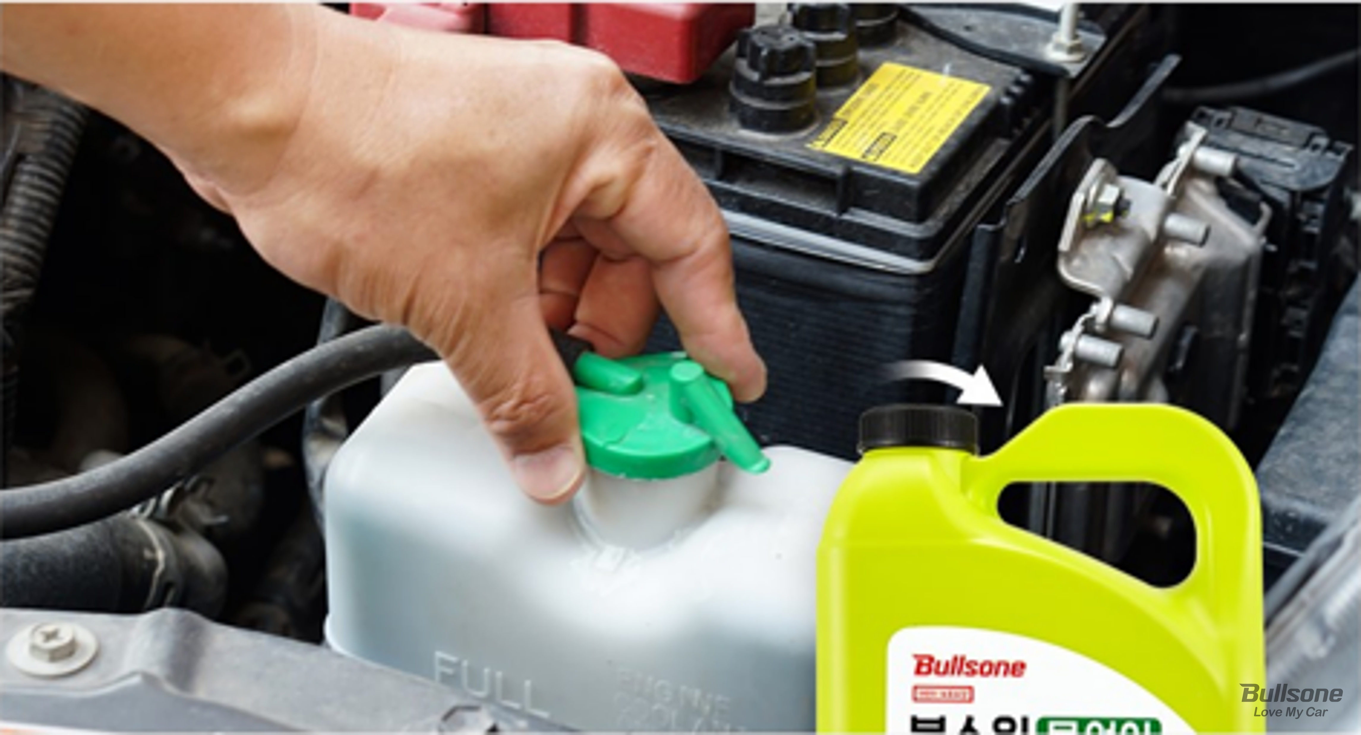 2. 부동액 주입구를 열고, 용기 상단의 캡을 누르면서 반시계 방향으로 돌려 열어주세요.