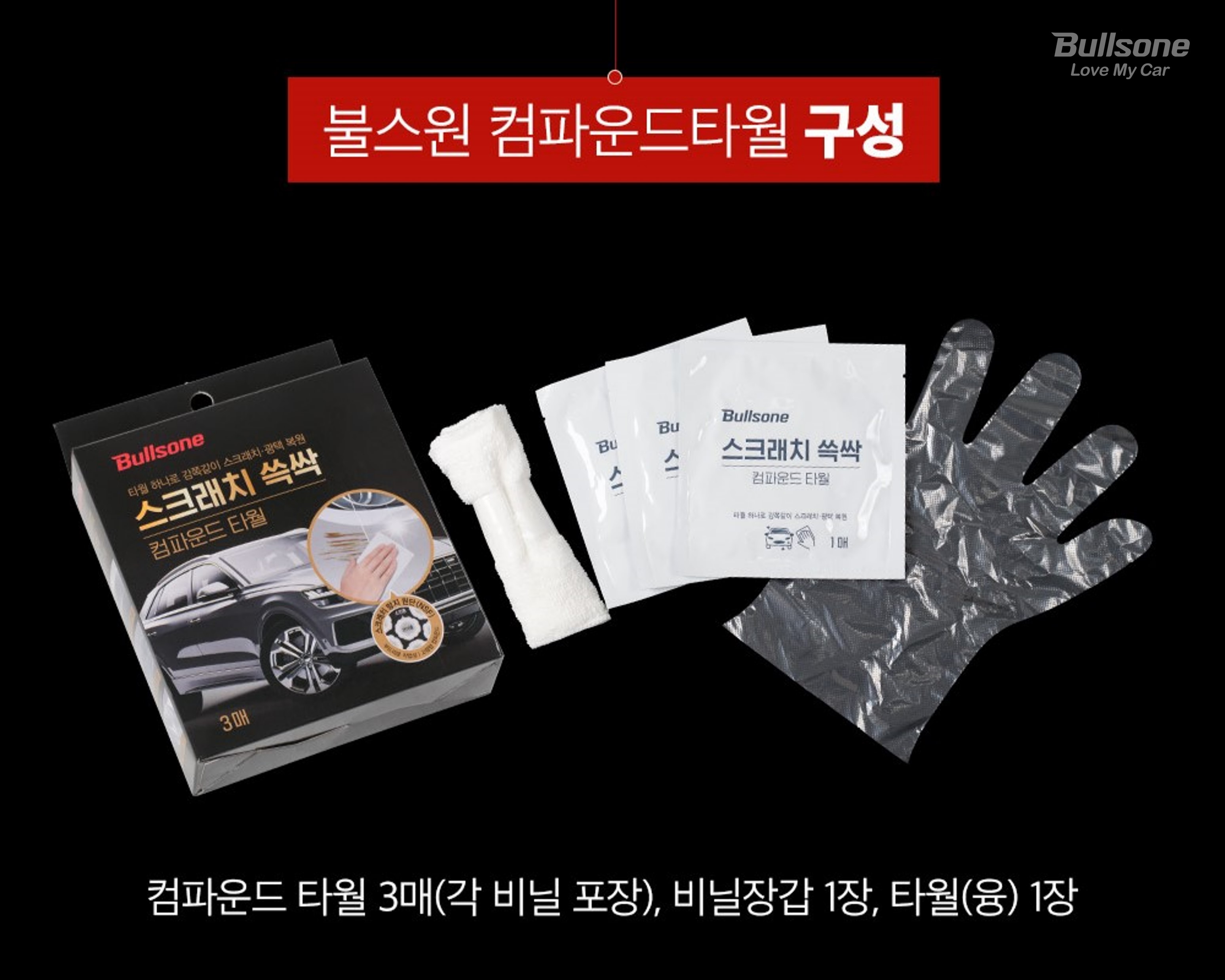 불스원 컴파운드 타월은 개별포장된 컴파운드 타월 3매, 비닐장갑 1장, 타월 1장으로 구성되어 있어요.
