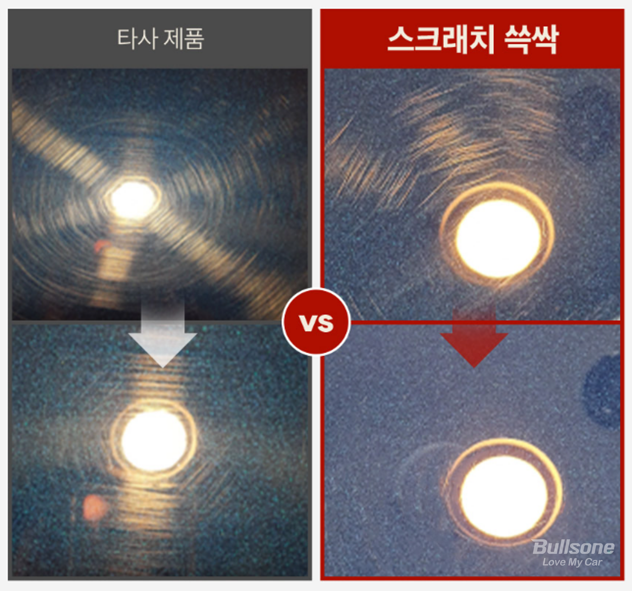 물세척하면 오일이 닦여 광택이 사라지는 타사 제품과는 다르게 스크래치 쓱싹 컴파운드 타월은 물세척 후에도 광택이 남아있는 것을 확인할 수 있는데요. 그만큼 일시적인 마스킹이 아닌 컴파운드의 진짜 흠집 복원력과 광택 복원 효과를 자랑한답니다.