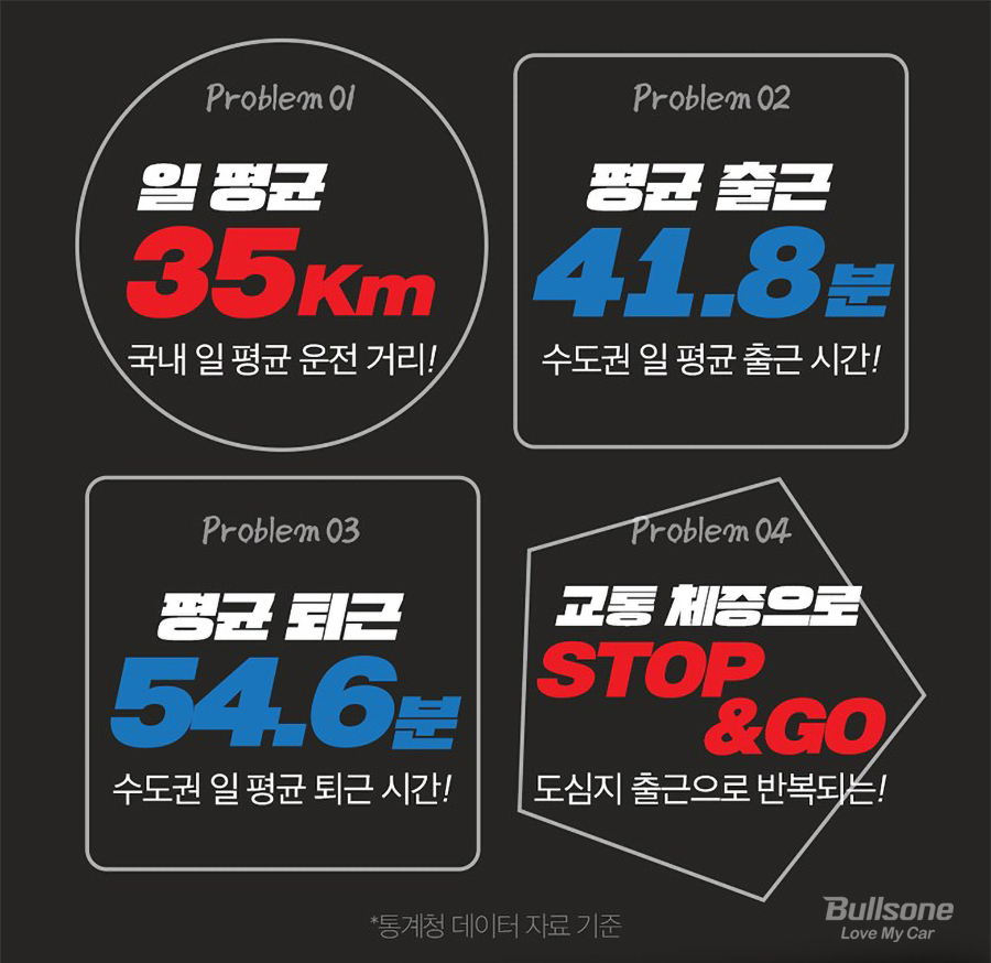 여러분들은 국내 일 평균 운전 거리가 35km라는 사실을 아시나요? 수도권 일 평균 출근 시간은 41.8분, 수도권 일 평균 퇴근 시간은 54.6분으로 교통 체증으로 인해 도심지의 STOP & GO 현상이 반복된다는 것을 아실 수 있습니다.