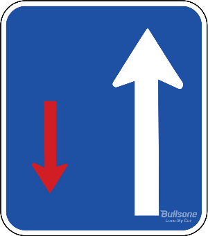 화살표만 그려진 이 표지판은 통행 방법에 대해 지시하는 표지로 좁은 골목길과 같은 곳에서 주로 볼 수 있습니다. 좁은 통로에서 각각 반대 방면에서 오던 차량이 마주할 경우 큰 흰색 화살표의 방향에 있는 차가 우선적으로 통행이 가능하다는 뜻입니다!