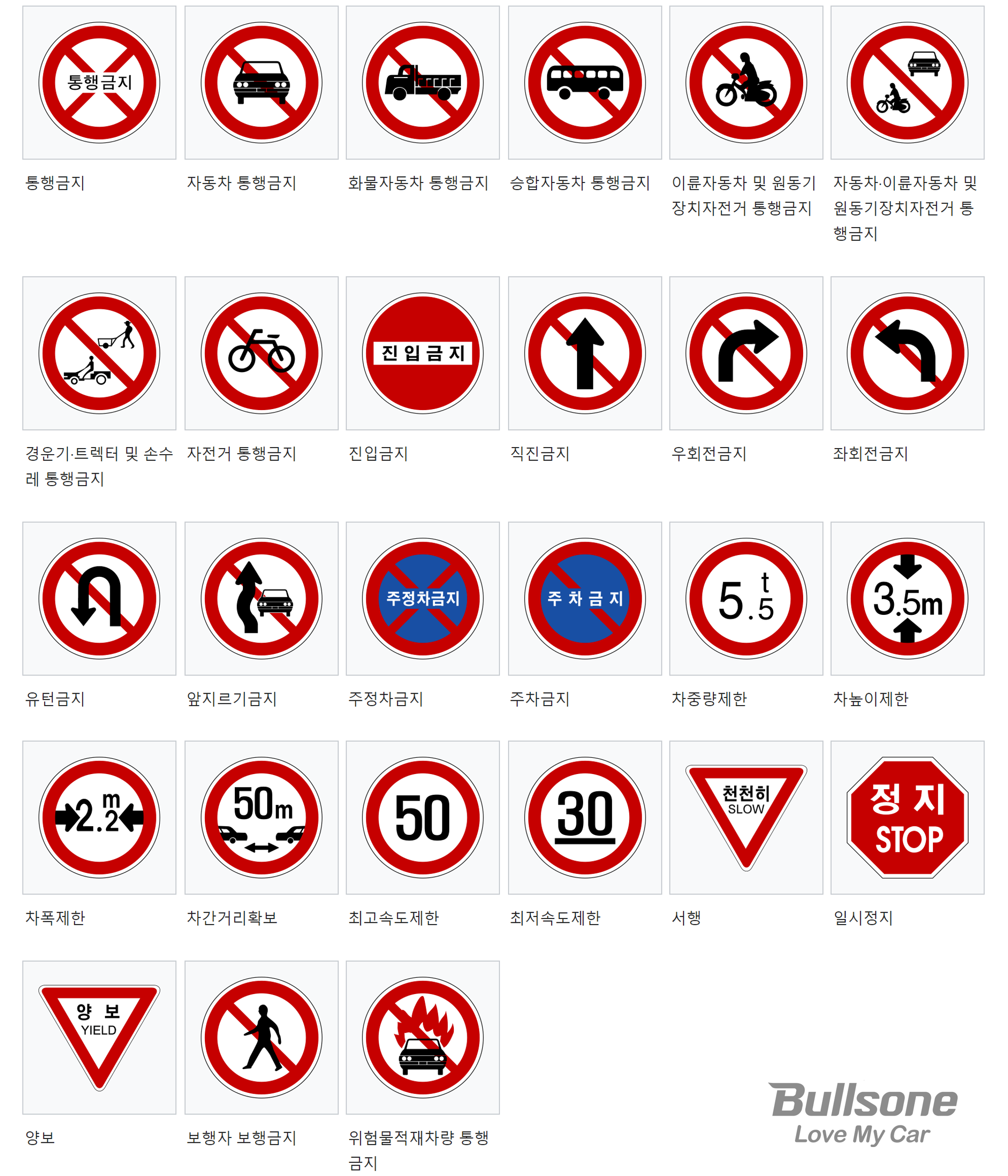 운전자 혹은 보행자로 하여금 어떠한 행동을 하지 못하도록 규제 항목을 알려주는 표지판도 있습니다. 흰색 배경에 빨간 테두리가 둘러진 원형 역삼각형, 팔각형 등의 형태로 되어있는 것이 특징입니다. 서행, 차중량제한, 주정차금지, 통행금지 등 도로의 원활한 소통을 위한 정보를 제공해요.