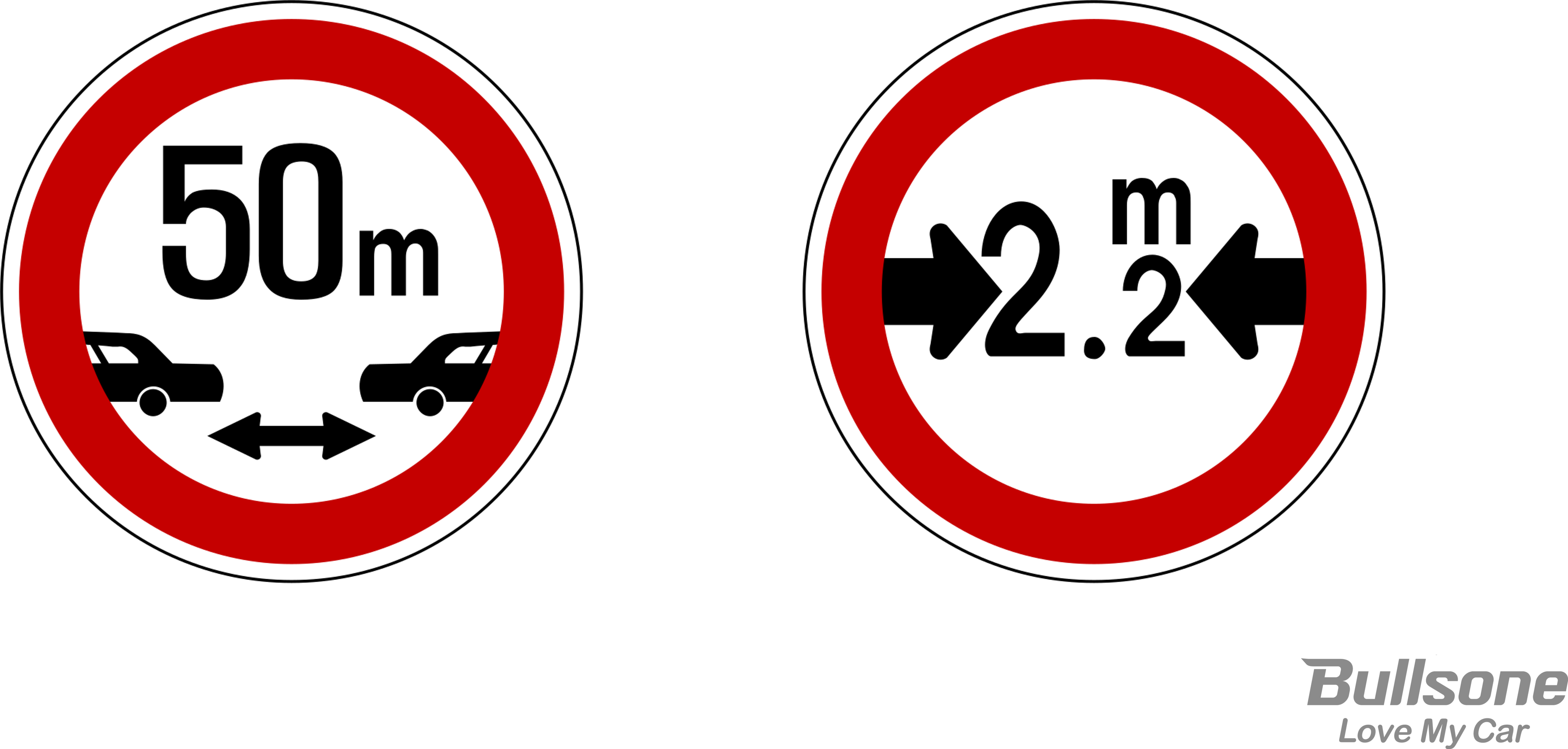 규제 표지판 중에서 차간거리와 관련된 표지판과 차 폭에 관한 표지판은 너무나 비슷하게 생겨 혼동하기 쉬운데요. 전자의 경우에는 차간거리 확보 표지판으로, 앞차와의 거리를 해당 거리 이상 유지해야 한다는 뜻입니다. 오른쪽 표지판은 차 폭 제한 표지판으로 터널과 같은 곳을 통행함에 있어, 표시된 길이의 폭을 초과하는 차량의 진입을 통제한다는 의미를 갖고 있답니다.