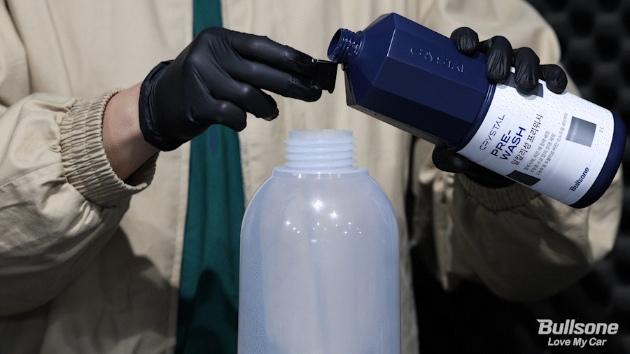 가장 먼저, 압축 분무기에 뉴 크리스탈 프리워시를 권장 희석비에 맞게 물에 섞어 담아주세요. 불스원은 오늘 1:10의 희석비에 맞춰 뉴 크리스탈 프리워시를 물에 섞어보겠습니다. 제품의 뚜껑이 8ml에 해당하므로 전용 지거가 없더라도 손쉽게 계량이 가능하답니다.