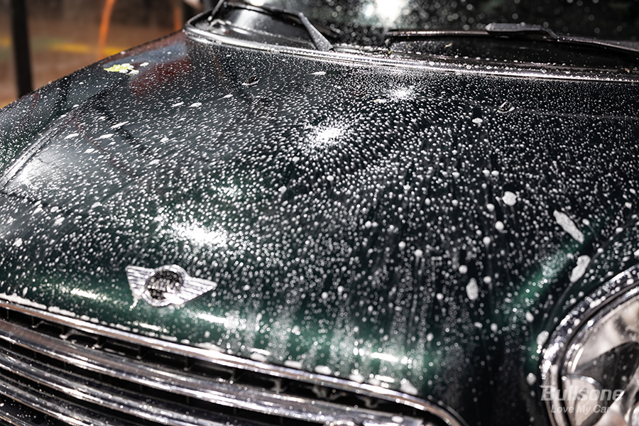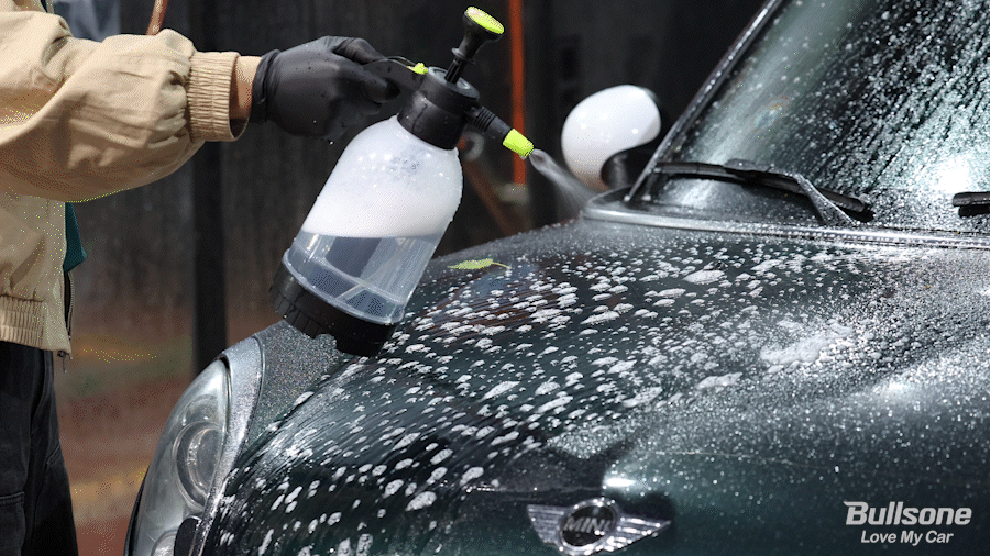 희석액을 차량 전체에 고르게 분사해주었다면, 3~5분 정도 두어 희석액이 도장면의 이물질을 충분히 불려줄 시간을 기다려주시면 됩니다.