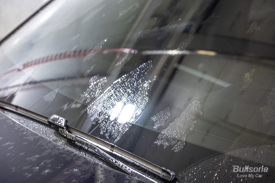 여기서 물기를 닦아내고 마무리해주셔도 좋지만, 장마철처럼 폭우가 내리는 시기에는 발수 코팅을 추가적으로 해주셔야 안전한 주행 환경을 조성할 수 있습니다. 자동차 유리의 유막을 제거하고 나면 기본적으로 자동차 유리는 '친수' 상태가 됩니다. 이는 유리가 물과 소위 '친하다'는 의미로 빗물이 유리면에 지속적으로 맺혀 운전자의 시야를 흐리게 하고 왜곡되게 합니다.