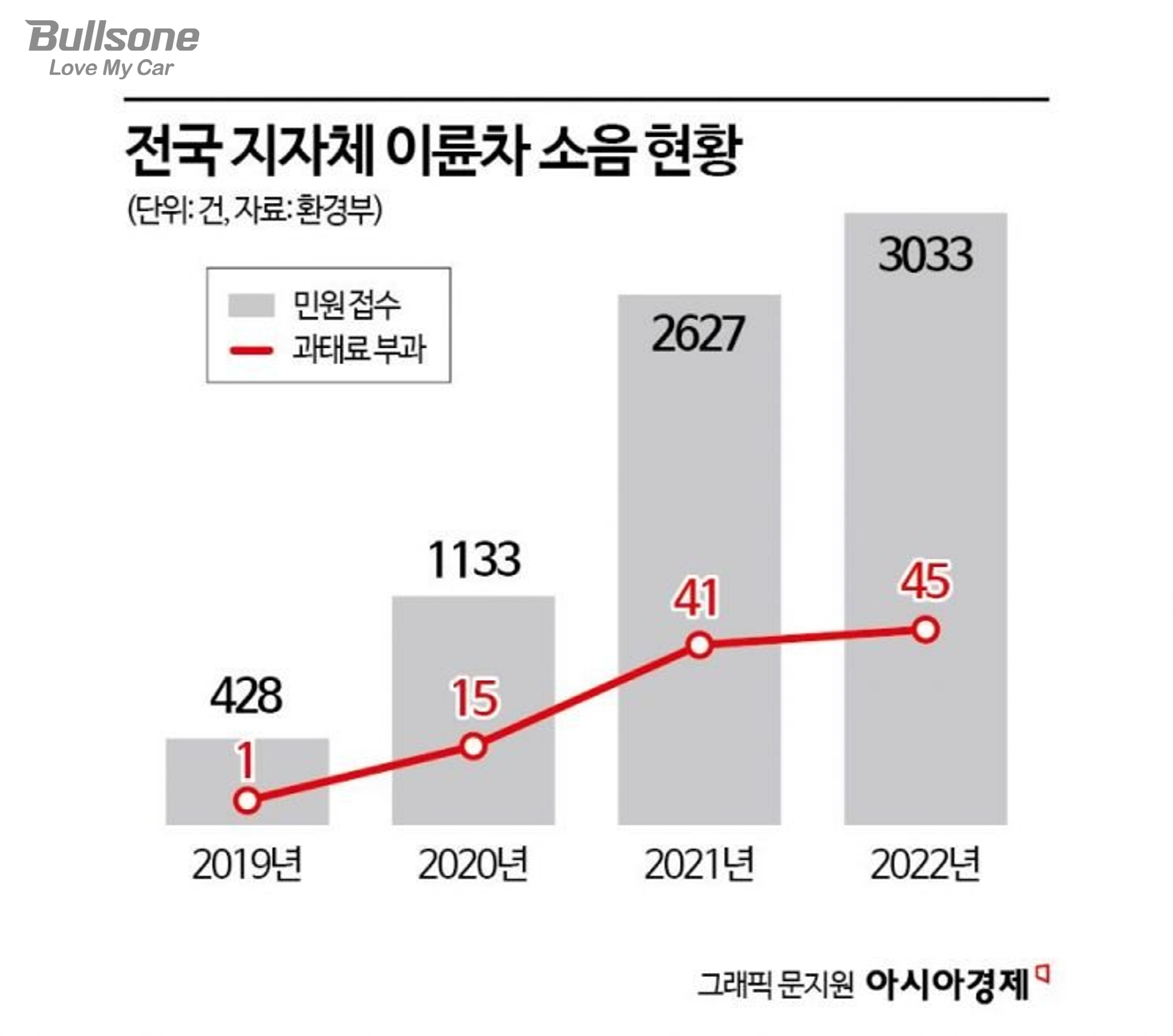 최근 몇 년간 자동차와 오토바이 소음에 대한 민원이 늘어나고 있습니다. 2021년에 접수된 소음 민원이 2627이었던 것이 2022년에 3033건으로 증가했으며, 3년 전인 2019년에 428건이었던 것과 비교해 7배가 넘게 증가했습니다. 하지만 이에 반해 과태료 부과건수는 턱없이 부족합니다. 2022년 기준 이륜차 단속대수가 3033건이었던 것에 비해 과태료 부과 건수는 45건으로 단속 대수의 0.6%에 불과했습니다.