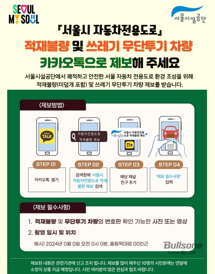 서울시설공단은 운전 중 무단투기 단속을 강화하기 위해 시민의 제보를 한층 더 간편화 했습니다. 자동차 전용도로를 운행하다가 쓰레기 무단투기를 목격했거나 적재 불량 차량을 발견한 경우, 즉시 신고가 가능한 카카오톡 채널 운영을 시작한 것입니다. 카카오톡 앱 내 ‘친구’ 화면 검색창에서 ‘서울시 자동차전용도로 적재불량 제보’ 채널을 검색하여 친구 추가하고 위반차량의 사진이나 동영상을 전송하면 쓰레기 무단투기 차량을 간편하게 신고할 수 있습니다.