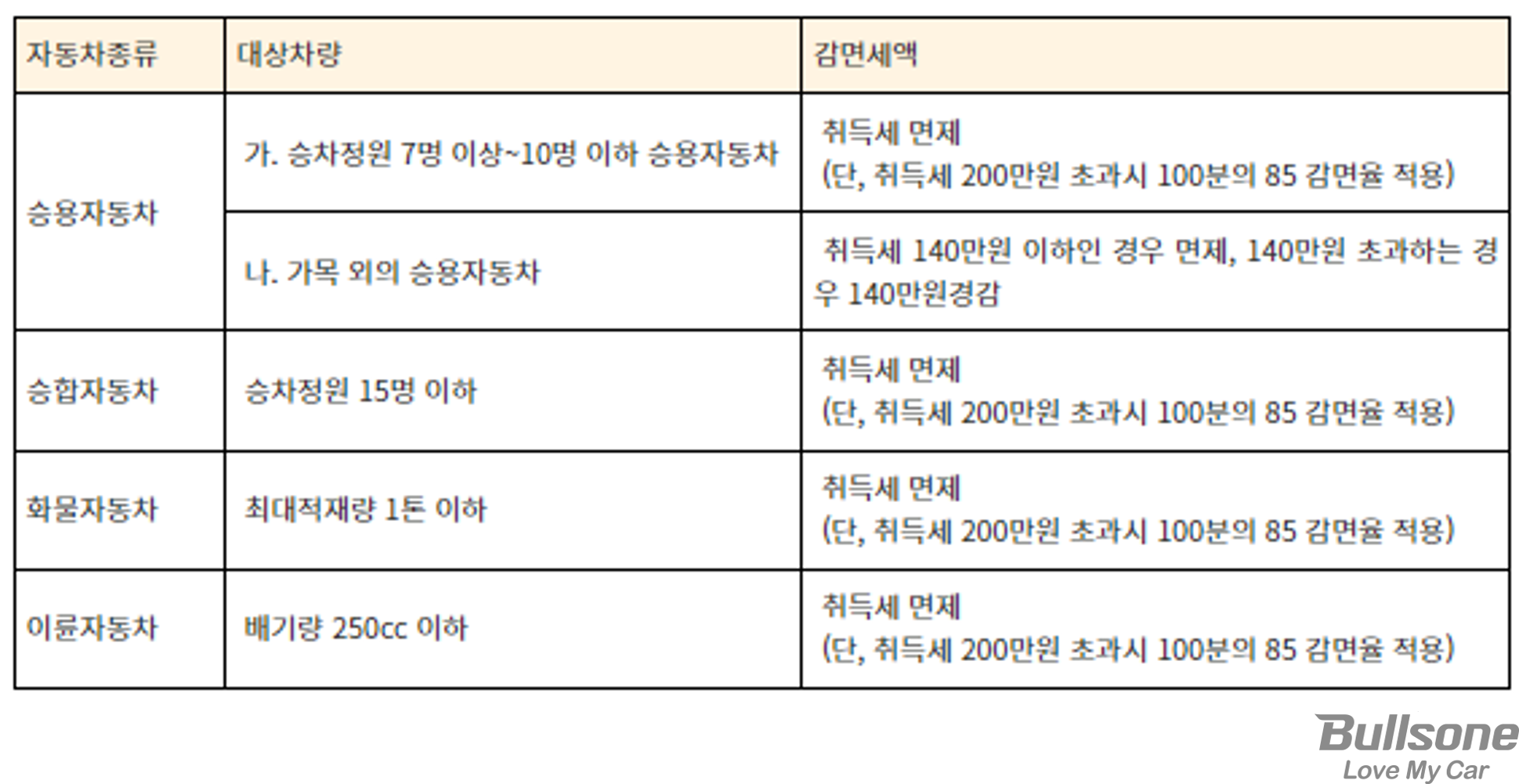 이 때 감면액의 한도는 자동차 종류에 따라 달라지는데요. 승차정원이 7명 이상 10명 이하인 승용차를 구매할 때는 취득세가 모두 면제됩니다. 그 밖의 승용차는 취득세가 140만 원까지 경감됩니다.