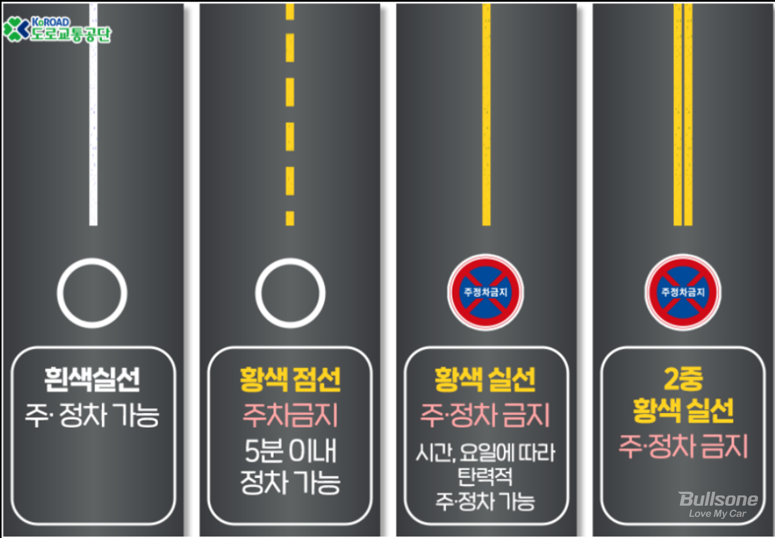 먼저, 도로에 주·정차가 가능한 지역을 살펴보면 도로 노면에 흰색 점선/실선으로 표시되어 있는 구역은 주·정차가 가능한 구역입니다. 황색 점선의 경우 주차는 금지되어 있으나 5분 이내의 정차는 가능하고, 황색 실선의 경우 주·정차가 모두 금지된 구역입니다. 다만, 지자체별로 시간과 요일에 따라 탄력적으로 주·정차가 가능한 곳으로 주변 표지판을 통해 주차 가능시간을 확인할 수 있습니다. 마지막으로 2중 황색 실선의 경우 예외 없는 주·정차 금지 구역으로 소방시설주변과 교차로, 횡단보도 등이 있습니다.