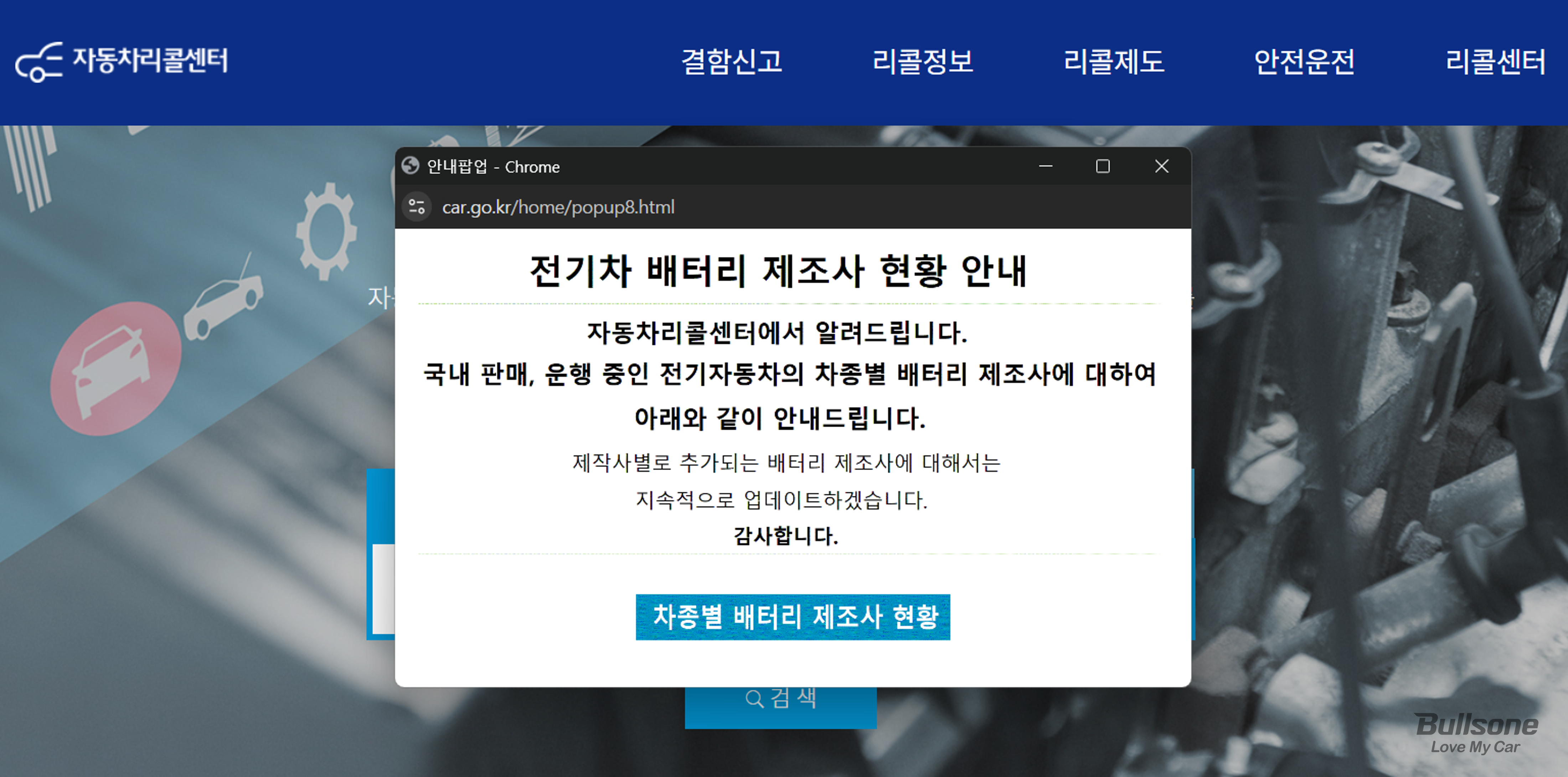 그렇다면, 내 차의 배터리 정보는 어디서 알 수 있을까요? 우선 각 브랜드 홈페이지에 방문하면 차량 배터리 정보를 확인할 수 있습니다. 내 차의 브랜드에 따라 홈페이지에 들어가 확인하시면 됩니다. 통합 홈페이지도 있는데요. 한국도로교통공단에서 운영하는 자동차 리콜센터(https://www.car.go.kr/home/main.do)에 접속하시면, 전체 전기차의 배터리 정보를 다운로드 받을 수 있습니다!