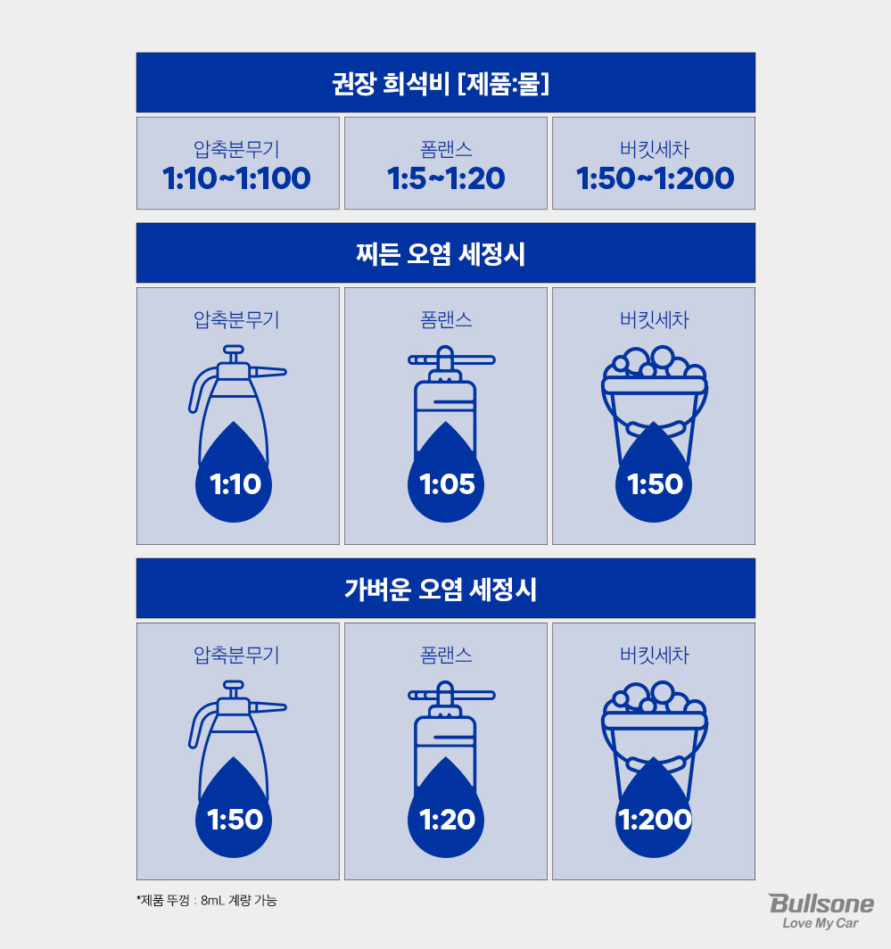 사용 방법도 매우 간편한데요. 불스원은 오늘 압축 분무기에 1:10의 희석비로 희석해 사용해보도록 하겠습니다!