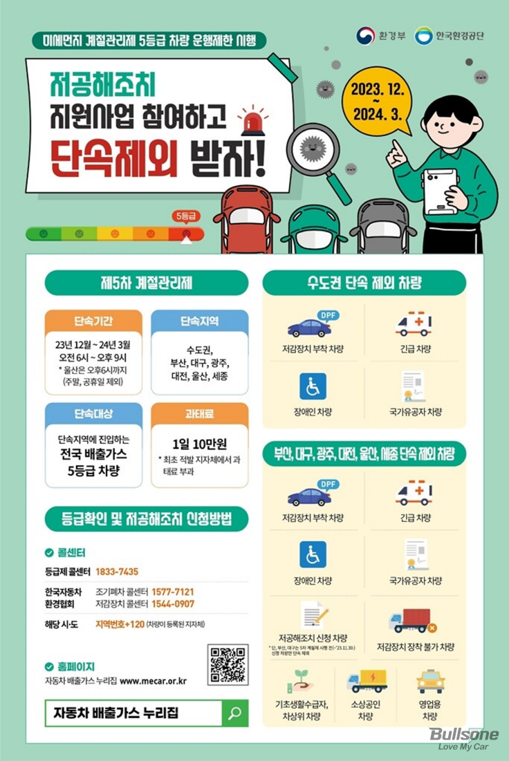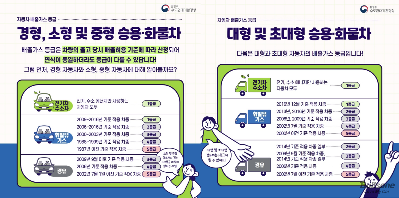 앞서 살펴보았듯 디젤 차량은 배출되는 가스 성분 중 질소산화물과 미세먼지가 많아 대기오염을 유발합니다. 이에 정부는 ‘대기관리권역의 대기환경개선 관련 특별법’을 제정하여 자동차 배출가스 등급에 따라 1등급부터 5등급까지 구분하고 있으며, 이를 ‘자동차 배출가스 등급제’라고 합니다.