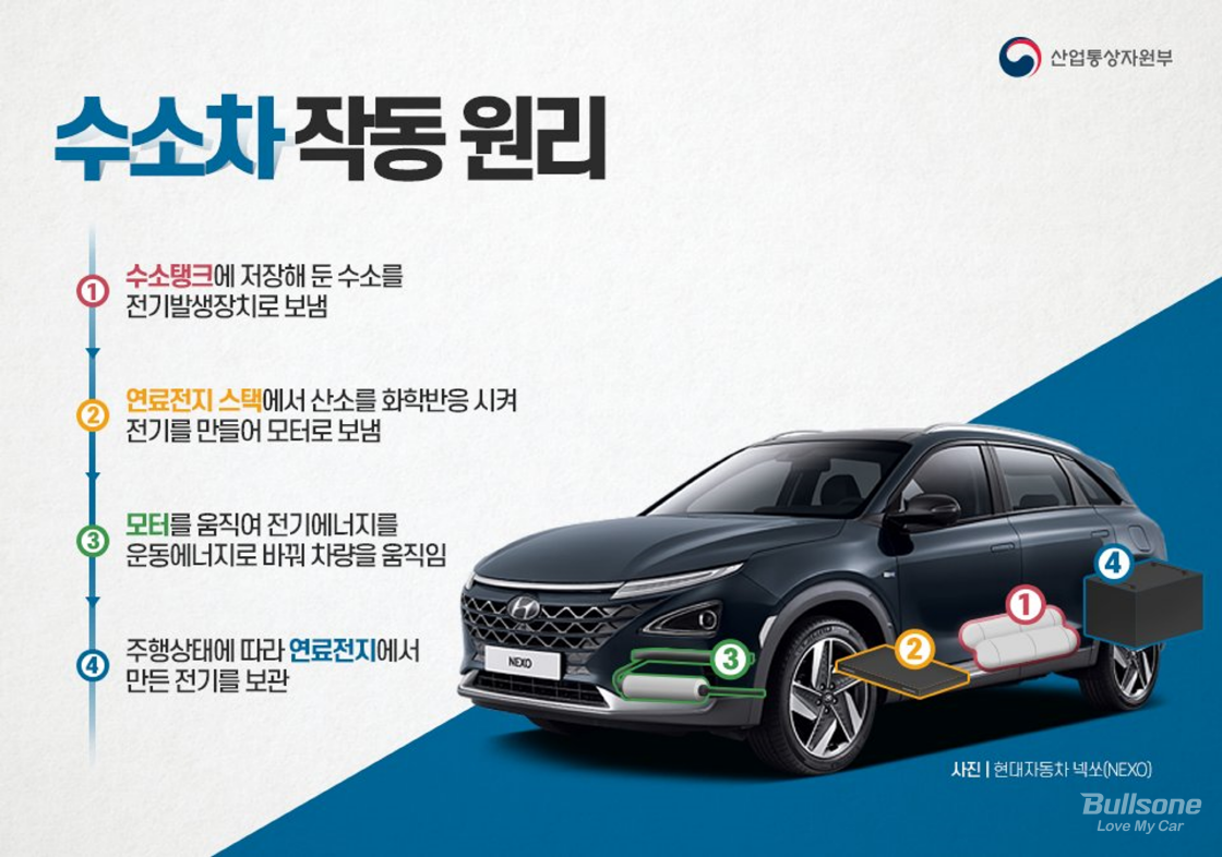 쉽게 생각하면 차량에 주입해 보관한 수소를 차 안에서 전기로 바꿔 차량을 운행하는 방식입니다! 직렬식 하이브리드 자동차나 디젤 기관차와 작동 방식이 비슷합니다!